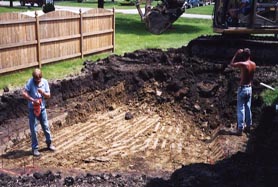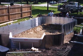 Excavation for a vinyl-lined pool is a job for an experienced backhoe operator. Normally, the side excavation is approximately two feet beyond the finished pool perimeter to allow for assembly and a concrete footing to be installed.